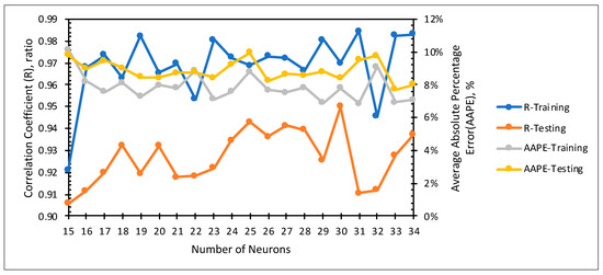 Figure 11 shows the sensitivity of the ANN performance to the number of neurons. The ANN performance indicators were the correlation coefficient (R) and the AAPE for the training and testing datasets. The figure demonstrates that, generally, increasing the number of neurons enhanced the ANN performance in terms of increasing the R of testing until reaching an optimum value of 30 neurons; then, the performance dropped. The reason for this behavior was the overfitting. Increasing the number of neurons to a very large value resulted in the ANN performing well on the training set but performing poorly on the testing set, which indicates overfitting. This is demonstrated by the figure, as it shows when the number of neurons increased more than 30, the R-value of training set generally increased, but the R-value of testing generally decreased. Therefore, the optimum number of neuron, in this case, was determined to be 30 neurons. Figure 12 shows the topography of the ANN with the optimized number of neurons.