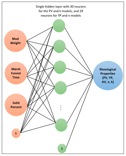 Al-Khdheeawi and Mahdi [35] applied an ANN to predict the apparent viscosity of water-based drilling fluid using the mud density and Marsh funnel time. They concluded that the developed ANN correlation could predict AV with an average absolute percentage error (AAPE) of 8.6% and a correlation coefficient of 98.8%. Gowida et al. [36] stated that the ANN can be used efficiently to predict the rheological properties of the calcium chloride (CaCl2) water-based drilling fluid based on mud density and Marsh funnel time.