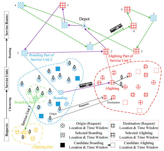 Based on the description given in Figure 2, we further illustrate the model by means of a simple example of the LIPDRS design process. Objective function (1.2) and constraints (2) and (3) are used to select service units from among the candidate service units and assign requests to them in accordance with the spatiotemporal features of the requests. The bottom of Figure 2 shows the process of selecting service units. In this example, the requesters submit requests that contain spatiotemporal origin and destination information, represented by oblique-textured and cross-textured circles, respectively. The candidate service units are represented by untextured squares. Ultimately, two service units are selected, represented by textured squares; they are identified as service unit 2 and service unit 5. These two service units serve two branches of requests with different destinations. Each service unit has two components: the boarding component (oblique-textured squares) and the alighting component (cross-textured squares). Both components contain the corresponding locations and time windows for the requesters and vehicles. Requesters walk to the boarding location indicated by the boarding component, are transported to the alighting location indicated by the alighting component, and then proceed to their destinations.