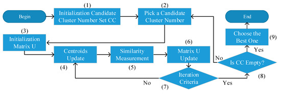 There are two initialization modules in Figure 3. Module (1) is for the initialization of the set of the candidate numbers of clusters, , wherein we construct a set-in increments of one within a given range. The other initialization module is module (3). The elements in the matrix of membership values for FCM are randomly initialized in accordance with the following constraints: the elements must satisfy and .