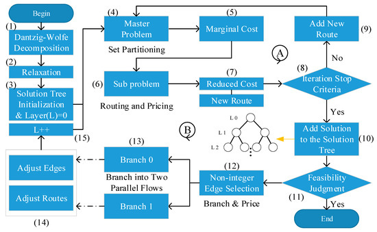 In Figure 4, the inner loop (denoted by A) applies the CG algorithm, iteratively solving the master problem and the subproblem. This loop is composed of modules (4)-(9). The outer loop (denoted by B) applies a branching scheme to avoid noninteger solutions. It is composed of loop A and modules (10)–(15). Modules (1)–(3) are the initialization modules for the two loops. Focusing on these two loops and the modules they include, we will elaborate on the details of the algorithm in Section 2.4.2, Section 2.4.3, Section 2.4.4, Section 2.4.5 and Section 2.4.6.