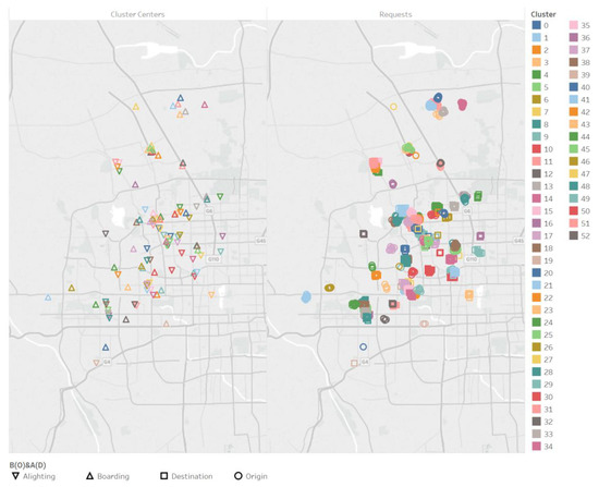 Regarding methodologies, combinations of request clustering and routing methods based on geographical similarities have been the focus of existing research. Cullen et al. [28] proposed a clustering-first, routing-second heuristic model. Bodin and Sexton [29] also constructed a clustering-first, routing-second heuristic model for the pickup and delivery problem with time windows (PDPTW). In this model, passengers are first partitioned into clusters. Then, the clusters are assigned to routes using the algorithm developed by Sexton and Bodin [30,31]. Finally, the algorithm swaps passengers between routes for route re-optimization. Dumas et al. [6] introduced the concept of mini-clusters, in which passengers with high spatiotemporal proximity are clustered together. In this algorithm, a heuristic method is used to produce a set of mini-clusters. Then, a column generation (CG) algorithm is used to optimally combine the mini-clusters into vehicle routes. Finally, the algorithm performs route re-optimization to obtain the optimal schedule for each vehicle. Desrosiers et al. [32] proposed another approach to mini-cluster construction by means of a parallel insertion method based on the spatiotemporal proximity of the requests. Ioachim et al. [33] applied an optimization-based technique instead of a heuristic method for the construction of mini-clusters. In addition to these studies, Pankratz [34], Bard and Jarrah [35], Qu and Bard [36], and Masson et al. [37] also applied clustering algorithms for the PDPTW. The results of these studies show that high-quality vehicle plans can be obtained only through the integrated consideration of clustering and routing.