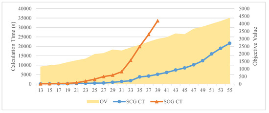From the perspective of the total passenger cost, as the number of service units increases, the walking time of passengers (and the corresponding generalized cost, ) gradually decreases. This trend is also roughly reflected in the passengers’ travel time (and the corresponding ticket cost, ) and ride time (and the corresponding general cost due to travel time, ), but the following difference is found: when the number of service units is 53, the passengers spend the least time and distance traveling (the corresponding and values are the smallest). The reason for this phenomenon is that these two indicators are jointly determined by the distribution of the service units and the designed routes. In a real-world road network, even a slight change in the service units can result in a change in the routes and, thus, the costs.