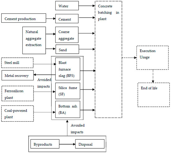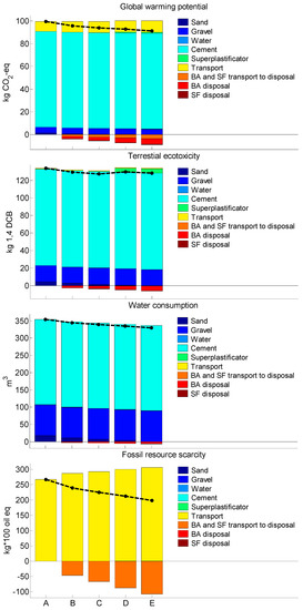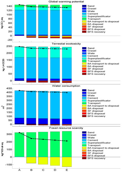 - According to the ReCiPe2016 midpoint H method, the increasing substitution of sand with BA in the concrete with SF as an additional binder and in the concrete with SF and BFS as additional binders led to lowered values of global warming potential, terrestrial ecotoxicity, water consumption, and especially, fossil resource scarcity. The BA-based concrete with more byproducts (SF and BFS) as additional binders brought more environmental benefits than the BA-based concrete with fewer byproducts (SF) as additional binders.