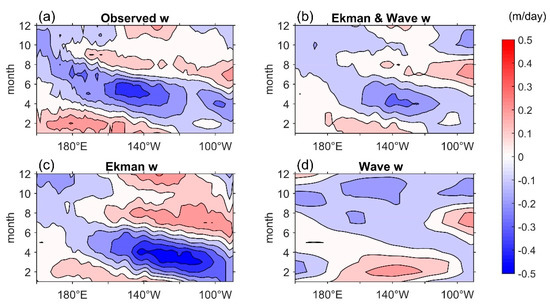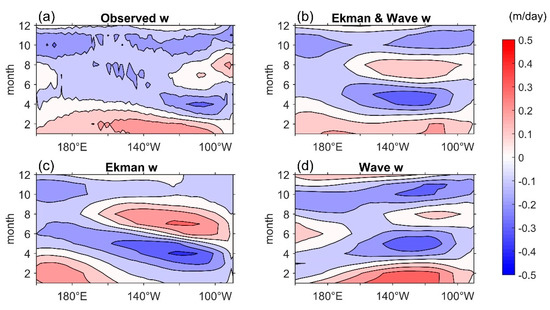 Indicated by Wang et al. [10,12], this linear combination derived from the ZC87 model is naturally the best way to capture contributions from the Ekman and wave upwellings in the equatorial Atlantic. The results in the present study further verify that this formulation worked just as well in the equatorial Pacific. Moreover, it confirmed the dominant role of the wind-driven Ekman processes in the upwelling annual cycle in the equatorial Pacific.