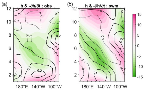 The equatorial Pacific annual cycles (averaged in 3° N–3° S) of the thermocline changes (shadings, units: m) and the observed wave upwelling estimated by thermocline tendencies (contours, units: m/day) in (a) observation and (b) shallow-water model (SWM) simulations.