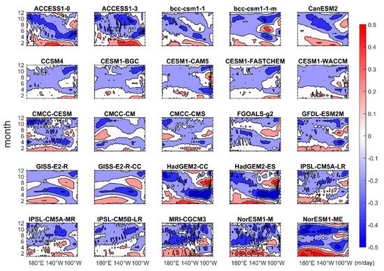 Before contrasting the upwelling annual cycles in the equatorial Pacific between the observation and CMIP5 simulations through this linear framework, we first took a glance at how the CMIP5 upwelling annual cycle performed in longitude–time evolutions (Figure 3). Compared to the observation (Figure 1a), not all CMIP5 models yielded realistic upwelling annual cycle patterns. Their performances are actually diverse. The weak semi-annual signal in the observational wave upwelling seemed to be enlarged and shifted westward in CMIP5 simulations. Yet, a large part of them still reproduced an annual signal in the central Pacific.