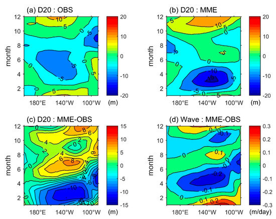 To investigate the origin of the systematic bias in the equatorial upwelling annual cycles in CMIP5 simulations, we needed to investigate the dynamics of the wave upwelling as estimated by thermocline tendency, which was originated from the thermocline. Figure 6a,b contrasts the annual evolution of the equatorial thermocline depth in terms of observation and CMIP5 MME. Apparently, they are not comparable regardless of amplitude or phase. The observational thermocline pattern was weak in the central equatorial Pacific, taking effects merely near the eastern boundary (Figure 6a). On the other hand, the MME thermocline pattern did not take place near the eastern boundary. Instead, the strongest area of MME thermocline pattern shifts westwards from the eastern boundary near 90° W to the central equatorial Pacific near 140° W, and its amplitude is nearly three times the strength of the observational thermocline depth pattern (Figure 6b). Demonstrated from the differences in thermocline annual evolution between the MME and observation, the CMIP5 MME tends to have an overestimation of thermocline depth strength in the central equatorial Pacific (Figure 6c). The MME bias in the annual evolution of thermocline depth was also directly transferred into the wave upwelling, which was estimated as thermocline depth tendency (Figure 6d).