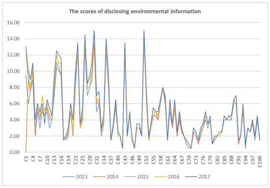 Figure 1 shows the scores regarding the disclosure of environmental information obtained by the sampled 100 companies, for the 2013–2017 period.