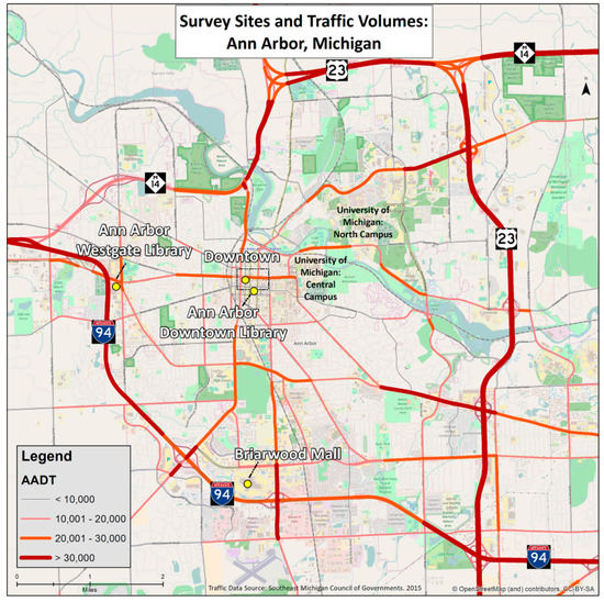 Study area and survey site locations in Ann Arbor, Michigan, with average annual daily traffic (AADT) volumes.