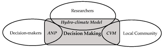 The conceptual framework used in this study is illustrated in Figure 2. The objective of the study was to investigate the relationship between local community, researchers, and decision-makers. For this purpose, ANP as a decision-making approach and CVM as economic evaluation were used to quantify the flood mitigation efficiency and to assess social acceptability of flood mitigation strategies in the study area.