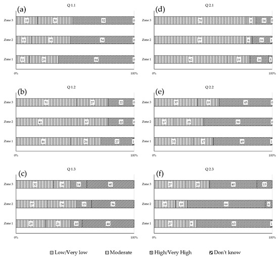 Respondents’ perception regarding climate change and flooding. (a): Q 1.1; (b): Q 1.2; (c): Q 1.3; (d): Q 2.1; (e): Q 2.2; (f): Q 2.3.