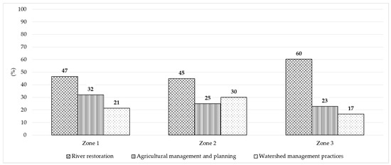 Figure 5 shows the allocation of each FMS in the three different zones in view of respondents’ WTP. According to this, river restoration strategy was the most popular in zone 1 (47%), zone 2 (45%), and zone 3 (60%).