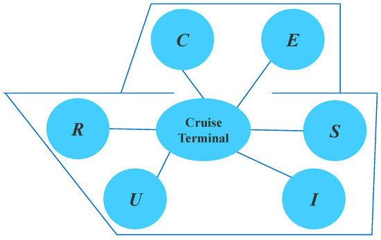 As Davies and Ellis [42] pointed out that “sustained prosperity may be achieved without a nation becoming ‘innovation-driven’, strong ‘diamonds’ are not in place in the home bases of many internationally successful industries and inward foreign direct investment does not indicate a lack of ‘competitiveness’ or low national productivity.” In the Porters’ diamond framework, it includes factor conditions, demand conditions, related and support industries, and company strategy, structure and rivalry [43]. The relevance of the Porters’ diamond framework with the aim of the context of the firm would create more value to its application in business [44]. Based on the Porter’s diamond framework, it facilities to establish a comprehensive CRUISE framework considering inherent resources and acquired capabilities to explore the uniqueness and sustainable development of different cruise terminals. Hence, we extend the traditional Porters’ diamond framework (1998) [45] into the Connectivity, Regional Competitiveness, Utilization, Infrastructure, Security, Environmental Management (CRUISE) framework in this section. To the best of our knowledge, this is the first attempt to extend Porter’s diamond framework into cruise research studies. Based on the literatures [14,31,32,39,46,47,48,49,50,51], we hypothesize that the CRUISE framework enhances Hong Kong’s and Shanghai’s cruise terminals regional competitiveness in the Asia-Pacific region in this section. The framework is a representation of reality. The CRUISE framework contains the six main components to perform a cruise terminal operation. The CRUISE framework can be elaborated as C refers to connectivity, R refers to regional competitiveness, U refers to utilization, I refers to infrastructure, S refers to security, and E refers to environmental management. The key elements of the CRUISE framework are given in Figure 4.