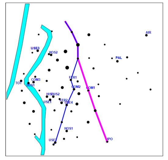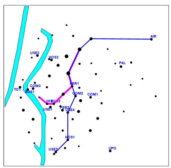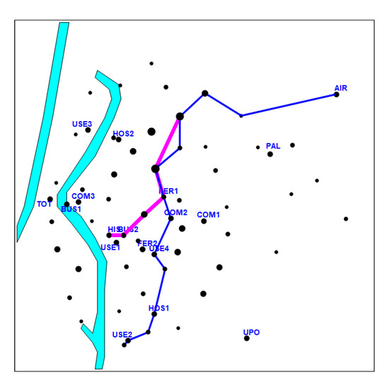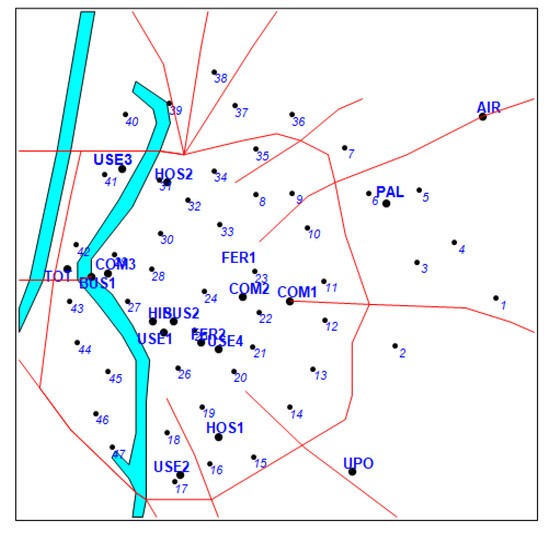 The methodology described in this paper was applied in the metropolitan area of Seville (Spain) to determine the most effective metro lines in terms of trip coverage. Input data were based on demography and mobility surveys conducted in 2002, with the purpose of comparing designs generated by our approach with those projected by the authorities. Parameter L was assumed to be 19 km. The current metro line in the metropolitan area of Seville has a similar length (19 km and 22 stations). The annual average of daily travelers during 2018 rose to 46.400 (in 2017, it was 43.917). Node set N contained 65 items (47 zone centroids plus 18 key nodes: bus stations, train stations, airport terminal, commercial centers, hospitals, university campus, etc.) in the urban area of Seville (Figure 2 and Figure 3). Total length of the network to be determined was constrained not to exceed 19 km. The network could be composed with a maximum of two lines; each of them would provide a number of travelers depending on the connected node pairs. Data concerning origin–destination trips were obtained from the Statistical Yearbook 2015 of Seville (available at http://www.sevilla.org/ayuntamiento/competencias-areas/area-de-h/anuario_2015).