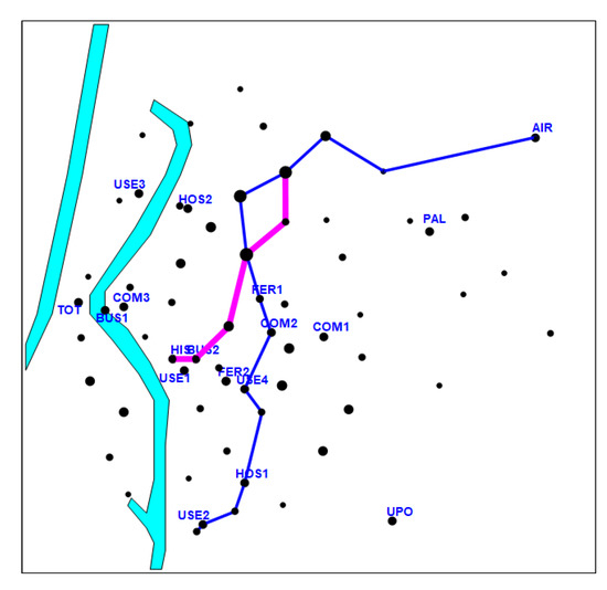 Scenario 3: For a maximum value of discrete curvature at the vertices of the alignments equivalent to that of the angle of 135°, the number of trips covered with a two-line network would be 50.665 trips per day, and its configuration would correspond to that shown in Figure 6.