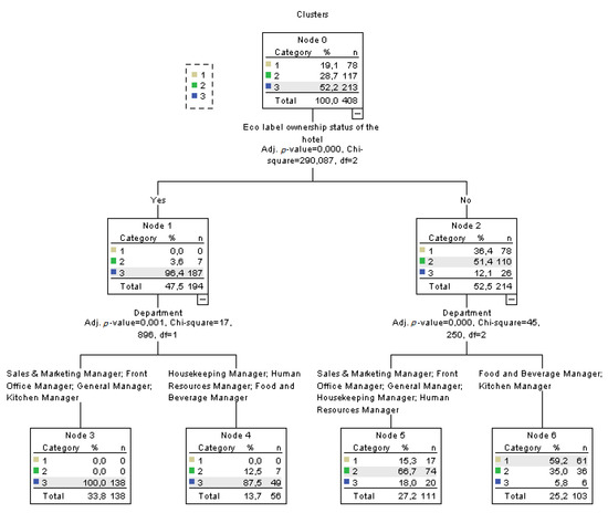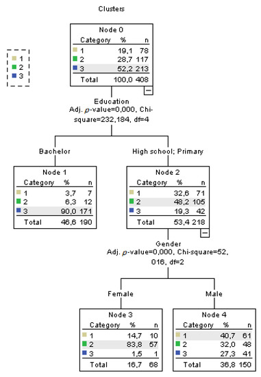 In CHAID analysis, in the model where the attitudes of the department managers towards eco-labeling are dependent variables, the personal features of the managers were modeled as dependent variables, as shown in Figure 1. In CHAID analysis, the results of the stepwise regression analysis are taken into consideration. According to the results of this analysis, the variable with the highest Chi-square value among the predicted variables which impacted on the dependent variable is first in place in the CHAID diagram. In the CHAID analysis, the sub-clusters which define the dependent variable best are observed. According to Figure 1, it is observed that the education level variable (x2(4) = 232,184 p = 0.000), is first in place among the independent variables, which are statistically significant concerning the attitudes of the department managers towards eco-labels. Ninety percent of the department managers holding college degrees were grouped in the third cluster. It was also observed that the number of college graduates was very low (4–6%) in the first and second clusters, who tended to be high school and primary school graduates. As a result of this analysis, holding a college degree had a definitive effect on their attitudes towards eco-labels. According to the results of the CHAID analysis, it was observed that the variable affecting attitudes towards eco-labels among the high school and primary school graduates was the gender variable (x2(2) = 52,016 p = 0.000). While 40% of the male high school and primary school graduates were grouped in the third cluster, this rate was only 15% among the female managers. According to this result, it was concluded that the department managers with a negative attitude towards eco-labels are particularly male, high school and primary school graduates.