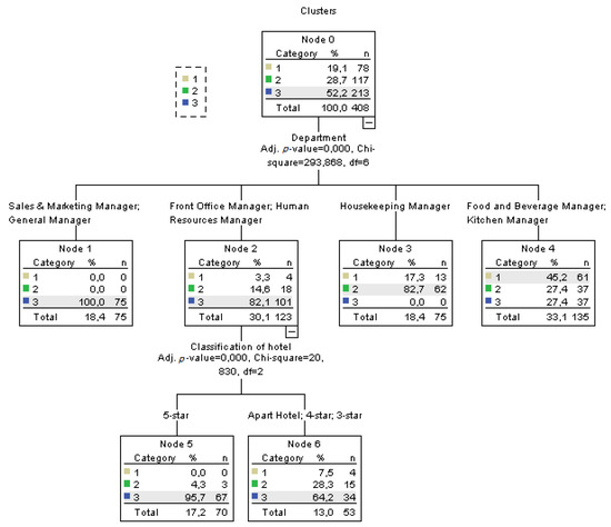 The personal and professional variables that have impact on the attitudes of the department managers on eco-labels have been studies using CHAID (Chi-squared automatic interaction) analysis which is a decision trees technique (classification tree, decision tree; CT&T). A CHAID analysis was applied to classify the effects of predicted variables as a whole by unpredicted variables. CHAID analysis is used to determine the relationships among one predicted variable. In CHAID analysis, all predictive variables are compared, and the best explained predicted variable is picked and then a set of data is categorized into sub-groups in line with this predictive variable. These sub-groups create new sub-groups for all significant predictive variables. Chi-squared automatic interaction analysis is a powerful statistical technique that analyzes data obtained via interval, ratio, and nominal scales at the same time and shows the relationships among predictive variables in all details covering all possible hierarchies [67]. Briefly, CHAID analysis creates sub-sets through categorizing factors affecting dependent variables according to their significance levels [68]. The relationships among the related predictive variables after the application of CHAID analysis were classified as knots and the diagrams obtained are shown in Figure 1, Figure 2 and Figure 3. First of all, the effect of personal features of the department managers on attitudes related to eco-labels was tested.
