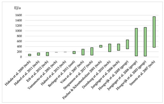 For the following estimations, only those studies that were published in 2010 or beyond were used, as we assume that models improve over time with increasing experience and scientific review (e.g., [34]). The more recent studies only estimate the technical or sustainable potential, which is also more relevant for decision-makers.