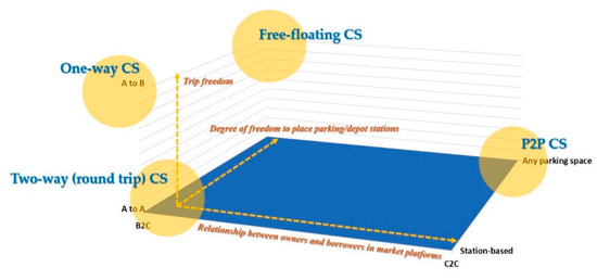 Classification of car sharing systems. Abbreviations: CS, car sharing; B2C, business-to-consumer; C2C, consumer-to-consumer; P2P, peer-to-peer.