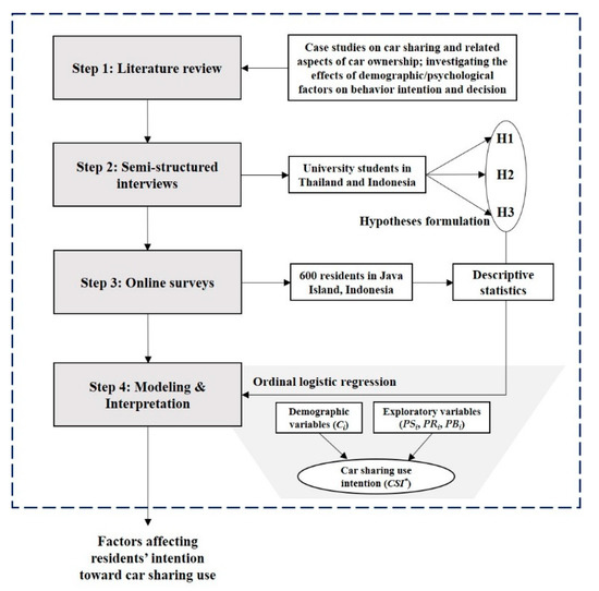 Figure 2 depicts the flowchart of the methodological framework for this study. The preparatory research based on the comprehensive literature review conducted semi-structured interviews to specify potential critical factors influencing people’s intention to use car sharing. Then, hypotheses were proposed to confirm whether those factors (exploratory variables) could positively or negatively influence one’s intention toward car sharing usage. Using a dataset from the online survey, this study attempted to develop car sharing use intention models and to verify the hypotheses. Finally, the estimated results of the model were interpreted. The literature review has been discussed in detail earlier in Section 3. Semi-structured interviews, the survey, and statistical modeling analysis are further addressed in the subsequent sections.