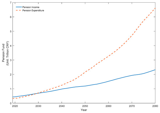 As population aging accelerates, the sustainability of China’s pension system draws more and more attention within international academia. Previous studies showed that China’s urban pension scheme is facing a severe challenge, where financial imbalance is inevitable in the long run [7,8]. For example, by developing an overlapping generation model, Coeurdacier et al. [32] suggested that relaxing or abandoning fertility restrictions would not offer much help to finance the urban pension system, particularly when children are considered the main source of old-age provision. In addition, Zeng et al. [9,33] argued that relaxing population control would relieve the pension burden, but fertility intention plays an essential role which should be improved. Applying a comprehensive risk assessment model, Zhao et al. [7] concluded that the urban pension fund would have a gap around 2045, while the accumulated pension deficits would expand to CNY 2270.59 trillion in 2088. Tian and Zhao [8] argued that if the pension age were delayed by five years, i.e., to 60 for women and 65 for men, the pension fund imbalance would be retarded by about two decades, and the accumulated pension deficits would be reduced by 64.25% in 2087.