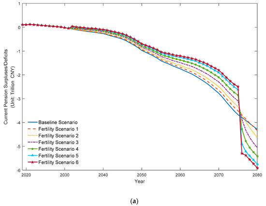 In this section, the long-term financial sustainability of the NRPP is assessed by projecting the changes of actuarial indicators from 2019 to 2080, including current pension surpluses/deficits and accumulated pension surpluses/deficits. Since the fertility assumptions in Section 5.1 include six different levels of possibility for couples to bear a second child, the method of scenario analysis is employed to evaluate and compare the impacts of demographic policy changes on the NRPP. We evaluate the financial sustainability of the rural pension scheme under two situations: (a) retaining the one-child policy (baseline scenario) or (b) implementing the two-child policy (fertility scenarios 1–6). In addition, we also run a series of sensitivity tests to examine the impact of changes in a few demographic and pension parameters on pension sustainability.