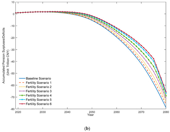 However, the simulation results provide another picture after the first of the second-child population retire in 2076. The pension payments would make a great leap, resulting in a huge expansion and a much faster increase in pension deficits, especially under the fertility scenarios with higher proportions of couples parenting a second child. For example, if 100% of couples parented another child, the current pension deficits would climb from CNY 5.29 trillion in 2076 to CNY 5.90 trillion in 2080, an increase of 37.78–39.69% over the baseline scenario. Meanwhile, the accumulated pension deficits would expand from CNY 43.00 trillion in 2076 to CNY 65.58 trillion in 2080, 16.78–31.09% higher than under the one-child policy.