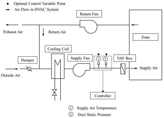 The building and its HVAC system were simulated using EnergyPlus version 8.9.0 (U.S. Department of Energy, Washington, DC, USA) [24]. The outputs, which include energy consumption, were generated from EnergyPlus and include quantities for flow, temperature, and pressure at each node in the building’s system. The HVAC system modeled in this study has an air handling unit that provides a VAV system to each room and a freezer that can be used also as a heat source in cold weather. Numerous controllable settings are required to manage a VAV system, from heating and cooling temperature settings and minimum airflow rate settings at the zone level to the minimum outside airflow, supply air temperature, and duct static pressure settings at the system level [25]. Among the various controllable variables in an HVAC system, the settings for supply air temperature and duct static pressure are selected specially for the study as the control variables in the VAV air-conditioning system. Figure 1 describes a typical VAV HVAC system that includes the control setting locations for the supply air temperature and duct static pressure.