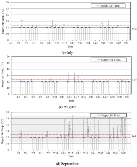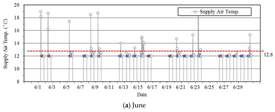 Figure 3 shows the changes in supply air temperature according to the time series during the optimal control operation from June through September. In June and September, the supply air temperature changes frequently, as shown in Figure 3a,d, but in July and August (the hottest months), the supply air temperature is set as low as 12 °C, as shown in Figure 3b,c. If the supply air temperature is maintained continuously at about 12 °C during normal operations, including July and August, the flow rate of the cold water that circulates in the cooling coil increases, which leads to an increase in the load rate of the refrigerator and an increase in the circulation of the cold water in the cold-water circulation pump, thereby increasing the energy consumption of the system that supplies the cooling source.