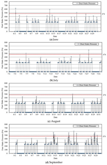Figure 4 shows the changes in duct static pressure according to the time series during the optimal control period from June through September. Duct static pressure in the optimal control operation mode is lower than 474 Pa and was kept constant during normal operations. The GA discovered energy savings for the fan by supplying less air than the existing air volume by keeping the static pressure low on the air supply side. However, any reduction in airflow that is due to low static pressure can also cause problems such as the temporary deterioration of indoor air quality, even when the required outdoor air intake for the design is satisfied. Hence, for practical design, ways to maintain proper indoor air quality must also be considered.