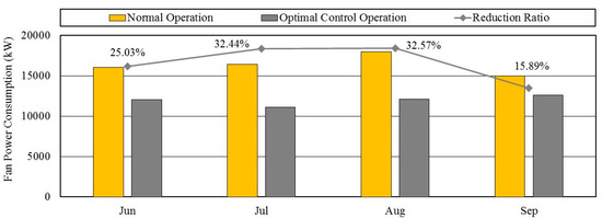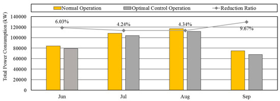 Figure 5 presents a comparison of monthly energy consumption with respect to normal operation mode versus optimal operation mode. The total amount of energy saved in July and August when the outside temperature is relatively high is about 4%, and is up to 9.7% in September. The rate of the total cooling energy consumption during the period of analysis from June through September was reduced from 384,296 kW in normal operation mode to 362,309 kW in optimal operation mode, which represents 5.7% in energy savings. The control value changes in the time series according to the changes in outside air conditions and the cooling load. The total energy consumption is calculated as the sum of the separate energy consumption of the fan, chiller, and cold-water pump. The effects of energy consumption for each of these three components in the HVAC system also were analyzed, as discussed in the next three subsections.