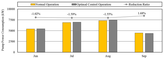 Comparison of cold-water pump energy consumption between normal operation mode and optimal operation mode for June through September.