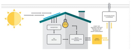 The concept of NEM-PV generating facility connection is shown in Figure 1 [39], illustrating the flow of import and export of the RE generated power to the grid and also the savings in utilizing electricity from the distribution licensee.