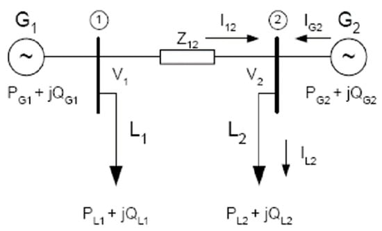 The previously-mentioned PV integration as DG installation guided by NEM can potentially reduce the power losses and this can be determined by using Equation (1). A two buses simple test can be used to consider this situation, as shown in Figure 3 [41].