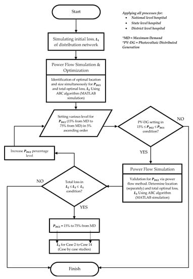 The selection of algorithm type is no concern since the contribution of this study mainly focuses on assessment towards bridging the gap of effectiveness between NEM requirement for maximum PV-DG capacity (i.e., 75% from MD) and the simulated PV-DG expansion-limit. In addition, the distribution networks from selected public hospitals which were used for the simulation are less complex in terms of number of buses compared to the others that have been used in the related literature, where multiple algorithms did not cause many differences in the outcome value. This can be proven through the comparison making between the ABC’s initial power loss outcome (without any integration of PV-DG) and optimal loss reduction outcome with the simulated result via PSO algorithm, where the accepted proximity range of output value from both methods shall fulfill the above expectation and significantly validates the overall coding setup process.
