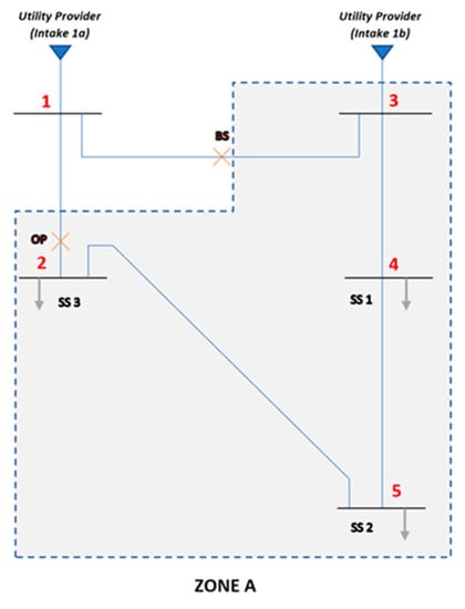 The distribution network in a National level hospital is fed by three different intake supplies (i.e., from the utility provider) through its radial network, however, the bus arrangement for simulation is only divided and performs in two main zones namely Zone A and Zone B. This scenario is similar with State and District level hospitals where the division of zoning for simulation are formed into two zones (Zone A and Zone B) for the National level, and one zone (Zone A) for District level hospitals.