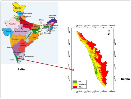 The area selected for the current study is the state of Kerala, which falls in the south-west region of India (8°18′ to 12°48′ N and 74°52′ to 77°22′ E), and has an area of 38,863 square kilometers. The Eastern side of the state is bound by Western Ghats, the western side by Lakshadweep Sea, the northern side by Karnataka, and the southern and eastern side by the Tamil Nadu state. The population of the Kerala state (as per the 2011 census) is 33.3 million, and it accounts for 3.01% of India’s population. The population density of the state is 859 persons per km2, one of the highest in the country, and exerts a lot of pressure on the per capita availability of water resources. This state has a humid tropical climate, categorized by the presence of high-intensity (heavy) rainfall, a high relative humidity, ample sunshine, and a high ambient air surface temperature. Besides these, the state is gifted with discrete elevation variations, from the upsurge of the land mass from 5 m below the mean sea level (msl), and rising to heights of 2695 m within a diagonal distance of 120 km. The aerial distribution of the slope classes showed that 89% of the area is considered to be slopes (Figure 1). From the presented Figure 1, it is clear that the state has a rolling topography with a Shuttle Radar Topography Mission (SRTM) digital elevation model at a 90 m resolution, and this topography plays a major role in water runoff and soil erosion. The significant erosion of the fine-textured topsoil and organic matter from the majority of the areas, as a result of the heavy rainfall and rolling topography, has given rise to soil consisting of large particles, and gravel with a low water holding capacity, thereby making irrigation more important.