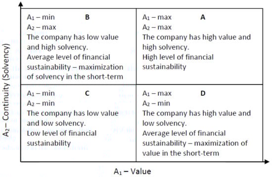 Using this technique, we build a complex indicator on the scale of [0;100] where the maximum number of points means the highest level of financial sustainability. We assume that financial factors included in the construction of the financial sustainability indicator are fully substitutable for each other. This approach supports the idea of ‘weak sustainability’, stating the substitution between environmental and human capital ensures non-decreasing total capital stock []. Hence, a decrease in one factor of sustainability is compensated by an increase in another factor without the depletion of the overall level of financial sustainability. Considering the multifaceted nature of financial sustainability and the inverse relation of some partial factors, we divide the core complex indicator (A) into a sub-indicator of value (A1) and a sub-indicator of continuity (A2) By estimating the sub-indicators, we get a better view of a relationship between the value and continuity (In a financial context continuity of business often refers to as solvency.) of an entity within a financial sustainability framework (Figure 1).