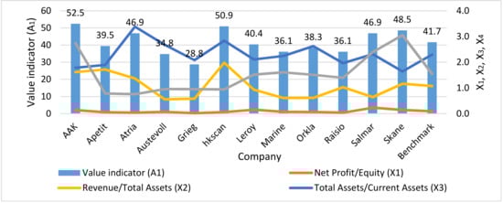 A visual presentation of the complex indicator of value (A1) and its components gives a more detailed view of a relationship between financial sustainability and value factors of food processing companies (Figure 4). We used the average value of the complex indicator in the sample group of companies as a benchmark. A group of business entities with comparatively high values of the complex indicator included AAK (52.5), Hkscan (50.9), and Skane (48.5). The profitability ratio of these companies ranged from 5.8% (Hkscan) to 14.5% (Skane), the market to book value ratio from 0.94 (Hkscan) to 3.05 (Skane), the total assets to current assets ratio from 1.64 (Skane) to 2.84 (Hkscan), and the productivity ratio from 1.17 (Skane) to 1.94 (Hkscan). Comparatively low values of indicators emerged in Grieg (28.8), Austevoll (34.8), Marine (36.1), and Raisio (36.1). The profitability of these companies fluctuated between 1.8% (Grieg) and 7.3% (Marine), the market to book value ratio between 0.95 (Grieg) and 1.61 (Marine), the total assets to current assets ratio between 1.96 (Raisio) and 2.68 (Austevoll), and the productivity ratio between 0.56 (Austevoll) and 1.03 (Raisio).