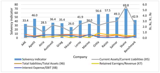 We depict the relationship between the complex indicator of solvency and financial ratios of food companies from Northern Europe (Figure 5). The group of food companies with relatively high solvency indicators included Skane (69.8), Raisio (57.5), and Orkla (56.6). The range of the liquidity ratio in these companies was between 2.3 (Orkla) and 5.7 (Skane), the debt ratio between 16.6% (Skane) and 44.5% (Orkla), the retained earnings ratio between 45.3% (Skane) and 86.2% (Orkla), and the inverse interest coverage ratio between 1.0% (Skane) and 14.4% (Orkla). The companies with relatively low complex indicators of solvency were Hkscan (26.0), Atria (28.5), and AAK (33.4). The liquidity ratio in these business entities ranged from 1.0 (Atria) to 2.1 (AAK), the debt ratio from 57.7% (Atria) to 62.1% (AAK), the retained earnings ratio from 7.0% (Hkscan) to 19.2% (AAK), and the inverse interest coverage ratio from 28.6% (AAK) to 52.7% (Atria).