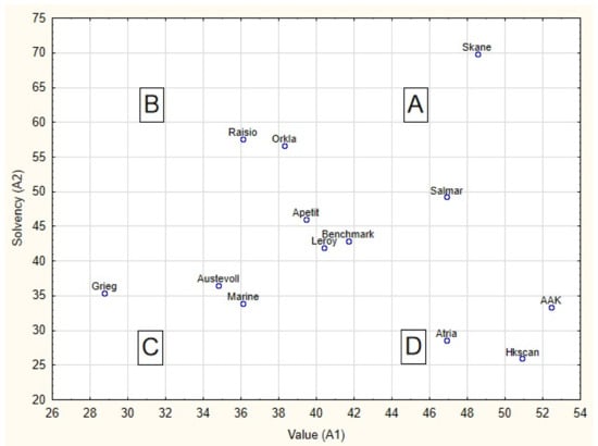 The horizontal axis illustrates the complex indicator of value, whereas the vertical axis demonstrates the indicator of solvency. Scenario A applies to such business entities as Skane and Salmar, as they retain a high value and comparatively high solvency. On the opposite side, companies Grieg, Austevoll, Marine, and Leroy represent a low value and solvency (scenario C). Scenario B is common for Raisio, Orkla, Apetit, and they retain a relatively high solvency and low value. Scenario D brings together such entities as Atria, Hkscan, and AAK that maximize their value but keep a low solvency. Both of these scenarios result in a moderate level of financial sustainability.