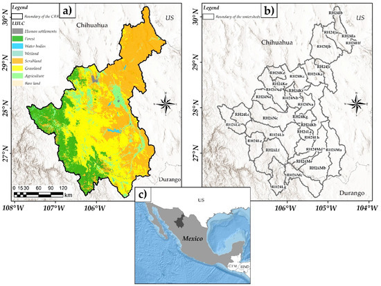 (a) Land-use/land-cover types of the Conchos River Basin (CRB), (b) Delimitation of the 31 watersheds of the CRB, (c) Location of the CRB in Mexico.