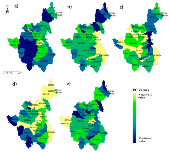 Classification of 31 watersheds based on the values of five principal components resulting from a principal component analysis. Conchos River Basin, Chihuahua, Mexico. (a) PC1, (b) PC2, (c) PC3, (d) PC4, (e) PC5. PC1 = Principal component 1, PC2 = Principal component 2, PC3 = Principal component 3, PC4 = Principal component 4, PC5 = Principal component 5.