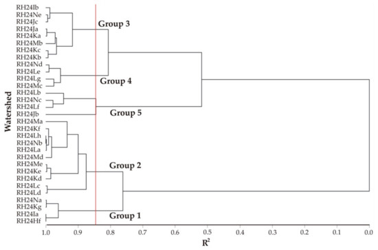 Figure 3 shows the dendrogram, resulting from the group analysis (GA) of the 31 watersheds. Five groups were identified based on their basic, relief, shape, and hydrology-type parameters, and considering a value of R2 = 0.84. Group 1, with seven watersheds, has the largest amount of low values for the shape, relief, and linear-type parameters, as can be verified in Table 3. Group 2, with eight watersheds, presents the lowest average values of drainage density, sinuosity of the main channel, and general flow length. Group 3, also with eight watersheds, showed the highest values of elongation ratio, drainage density, mean slope of the main channel, and general flow length. Group 4, with four watersheds, has the highest values in maximum and minimum height, mean slope of the watershed, mean distance, unit shape factor, resistance number, and drainage intensity. In this group, the lowest values correspond to the elongation ratio. Group 5, also with four watersheds, presents the largest amount of high values for the basic, shape, relief, and linear-type parameters. The multivariate analysis of variance (MANOVA) showed significant differences among the groups of watersheds, showing a value of Wilks’ lambda equal to 0.0025, with a value of p < 0.0001.