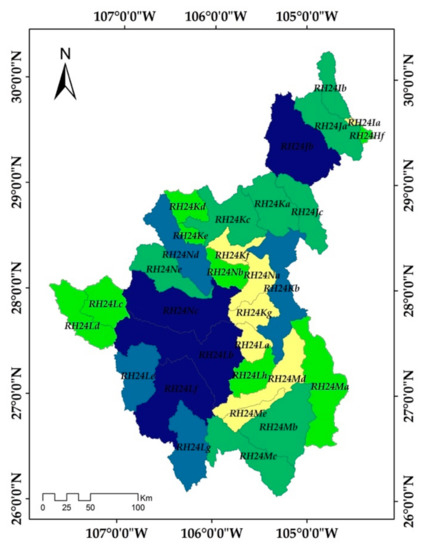 Data of the CRB was obtained from the online GIS source of CONABIO [52]. Likewise, the data of the 31 watersheds composing the CRB (Figure 2) were obtained from the Watershed Water Flows Simulator [53]. The relief and hydrology type parameters were estimated by processing the necessary data from a Digital Terrain Model (DTM), with a resolution of 15 × 15 m, downloaded from INEGI [54]. The values of the basic parameters from the watersheds were obtained by using the Hydrology tool [55] of ArcMap© 10.3 (ESRI, Redlands, CA, USA; https://wwwesri.com/en-us/home). The values of the shape, relief, and linear type parameters were calculated from the equations listed in Table 1.
