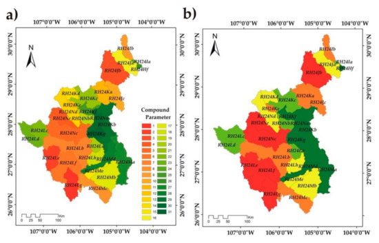 The compound parameter (Cp) was the second methodology employed to prioritize the watersheds. The value of Cp was calculated for each of the 31 watersheds composing the CRB (Figure 5a). Based on the value of Cp, watershed RH24Hf received the highest priority (1), followed by the watershed RH24Le (2). By comparing the results from GA and Cp, Group 4 was identically integrated by the two methodologies. This group is characterized by watersheds having the highest average values of maximum and minimum height, elongation ratio, elongation index, mean watershed slope, slope of the main channel and unit shape factor. The high values of these parameters correspond to watersheds with a high erosion susceptibility [88]. Conversely, Group 5 was formed by watersheds having the highest values of main channel length, watershed length, contour length, all channel lengths, Gravelius compactness coefficient, shape factor, massivity coefficient, mean distance, Kirpich concentration time, sinuosity of the main channel, average peak flow, texture ratio, river frequency and resistance number. This coincide with high values of Cp, which correspond to watersheds distributed in the southwestern zone of the study area and may have a low erosion susceptibility [61].