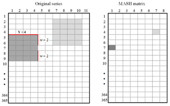 Moving average over shifting horizon (MASH), proposed by Anghileri et al. [13], is a non-parametric trend test method for seasonal data. The MASH method can show the intra- and inter-annual changes of data at the same time. The MASH method was first proposed to evaluate the intra- and inter-annual variation trend of daily streamflow time series. It can smooth the original streamflow time series by calculating the average value of continuous days over the same year and calculating the average streamflow of continuous years over the same day. Then the intra- and inter-annual variation trend of the original streamflow process can be illustrated. The purpose of MASH is to construct a matrix, as follows: