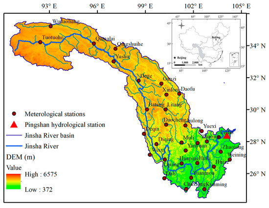 The Jinsha River Basin originates from the upper reaches of the Yangtze River in China. The Jinsha River Basin flows through the five topographical geomorphic units of China including the Qinghai–Tibet Plateau, the Western Sichuan Plateau, the Hengduan Mountains, the Yunnan–Guizhou Plateau and the Southwestern Sichuan Basin [43]. The total length of the river is 3486 km, accounting for 77% of the total length of the upper reaches of the Yangtze River, and the control area of the river basin is 480,000 km2, accounting for 50% of the total area of the upper reaches of the Yangtze River [44,45]. The climate of the Jinsha River Basin has typical seasonal and regional differences and is influenced by plateau climates and stereoscopic climates [46].