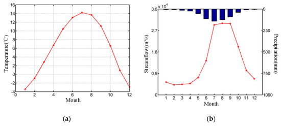 As for the intra-annual variation characteristics, we found that the highest precipitation occurred from June to September, which resulted in high streamflow in summer and autumn. Lower precipitation was observed in spring and winter, which resulted in less streamflow. The temperature gradually increased from January to mid-July, and the highest temperature, observed in mid-July, was 15 °C. The temperature then gradually decreased from mid-July to December.